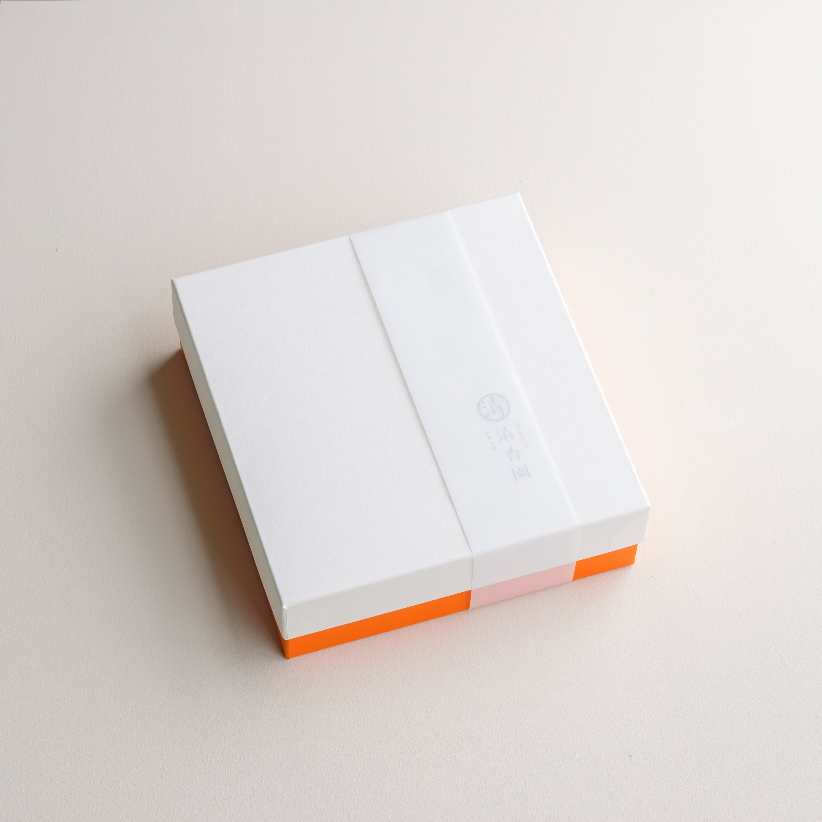 上質な紙の風合いを生かした貼り箱に、銀刷りの半透明帯を巻いた特別仕様。